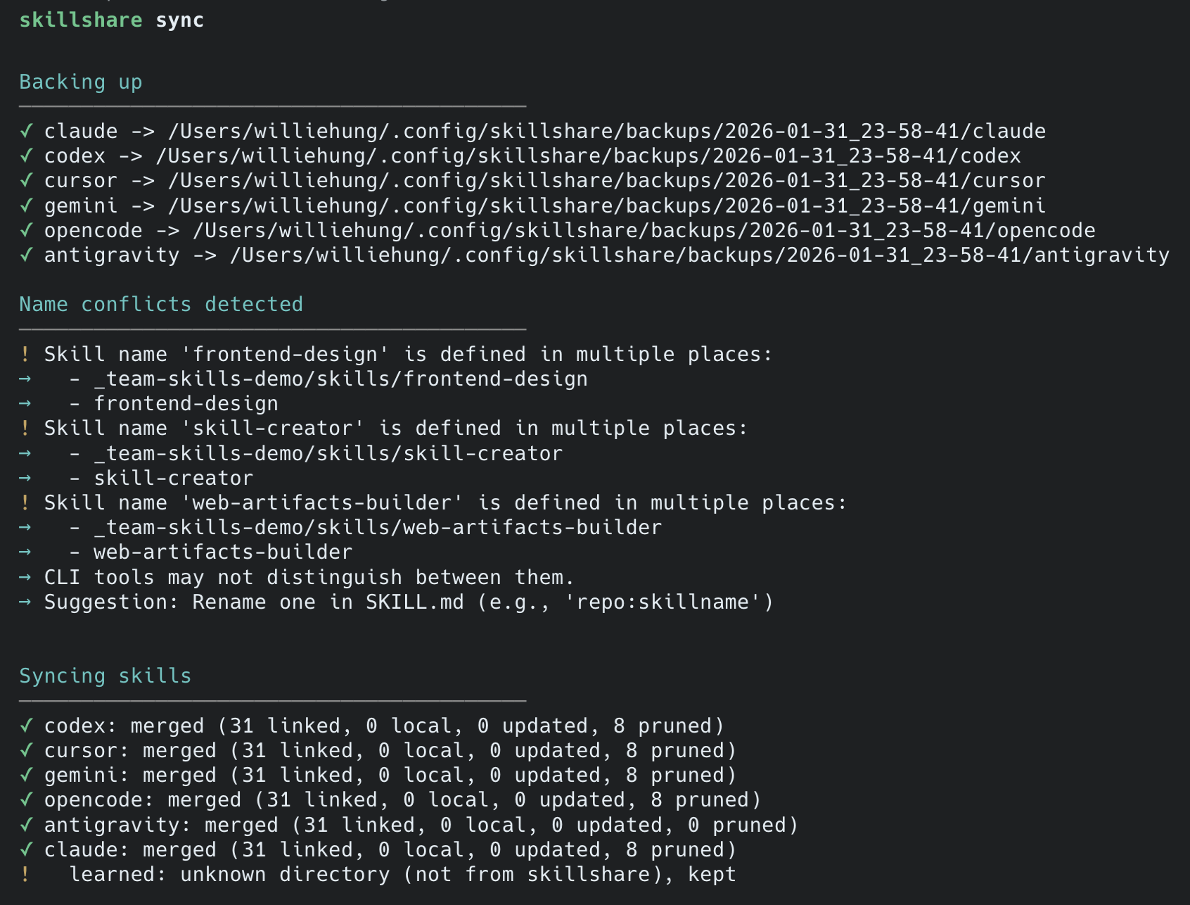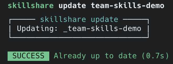 skillshare install [email protected]:company/skills.git --track --name company-skills